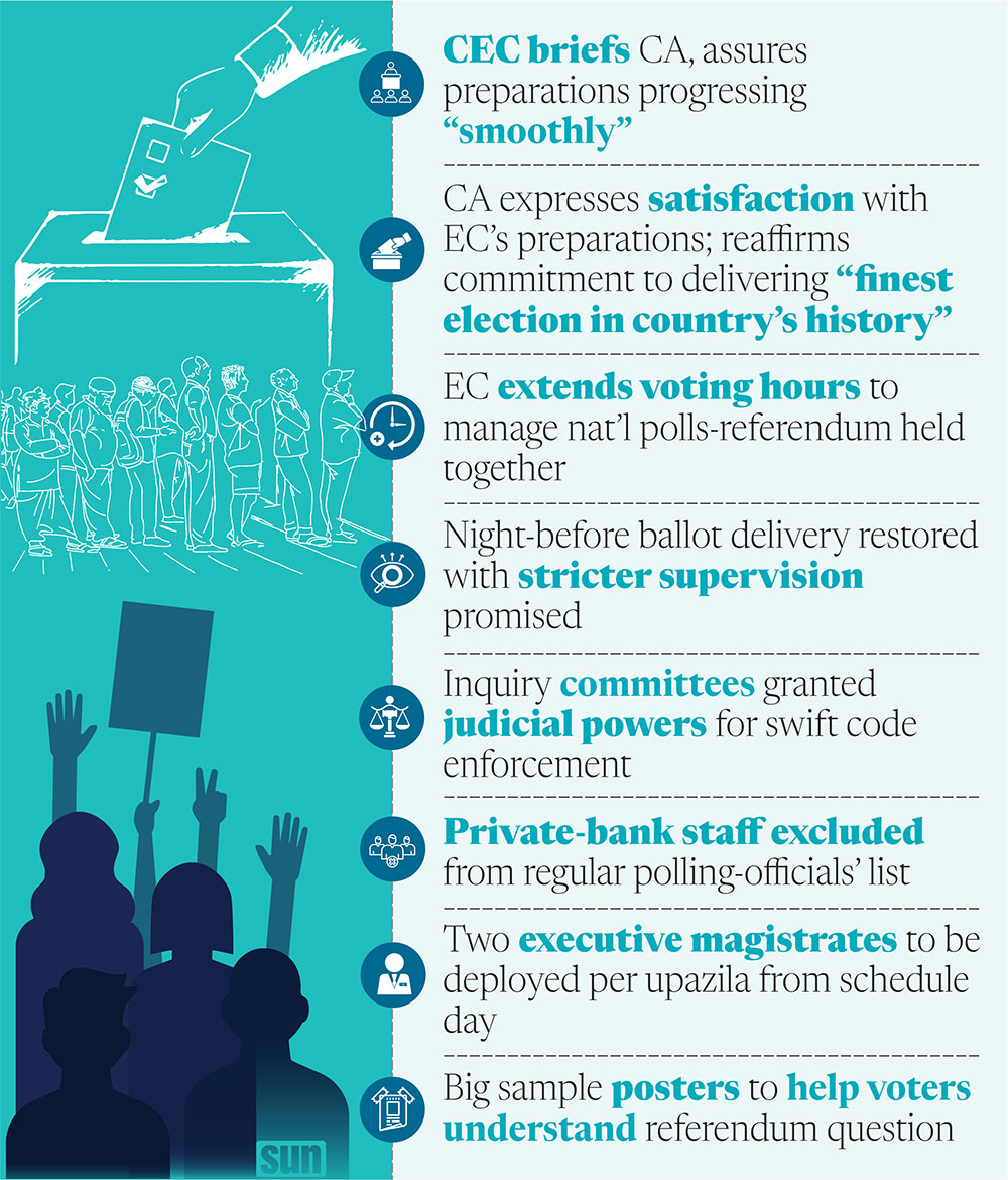 On Sunday evening, the CEC and all four commissioners briefed the chief adviser on the preparations at the State Guesthouse Jamuna, assuring him that arrangements for the February polls were “advancing smoothly”.